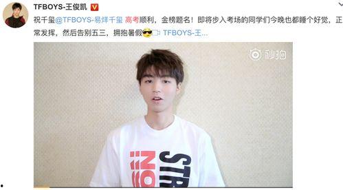 作为TFBOYS的成员,王俊凯在高考期间,通过微博为考生们加油。他写道:“高考加油,我们一起努力,为了梦想,为了未来!”这句简单的话语,却充满了力量,激励着无数考生。